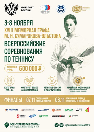 С 3 по 8 ноября 2025 года в Санкт-Петербурге состоятся Всероссийские соревнования по теннису «ХVIII Мемориал графа М. Н. Сумарокова-Эльстона» по адресу ул. Ярослава Гашека, д. 19 стр. 1, ФОК "Территория Спорта".